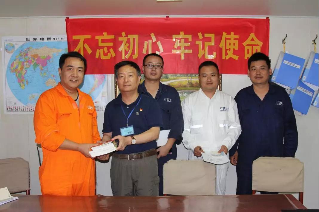黨群部工作人員向船贈送了習(xí)近平總書記《關(guān)于“不忘初心,牢記使命”重要論述選編》、《習(xí)近平新時代中國特色社會主義思想學(xué)習(xí)綱要》、《黨的十九大精神見面學(xué)習(xí)手冊》等書籍,紀檢監(jiān)察室工作人員向船精心制作了以"廉"為題材畫報。為船員帶去精神食糧,鼓舞他們積極的找差距、抓落實、補短板。