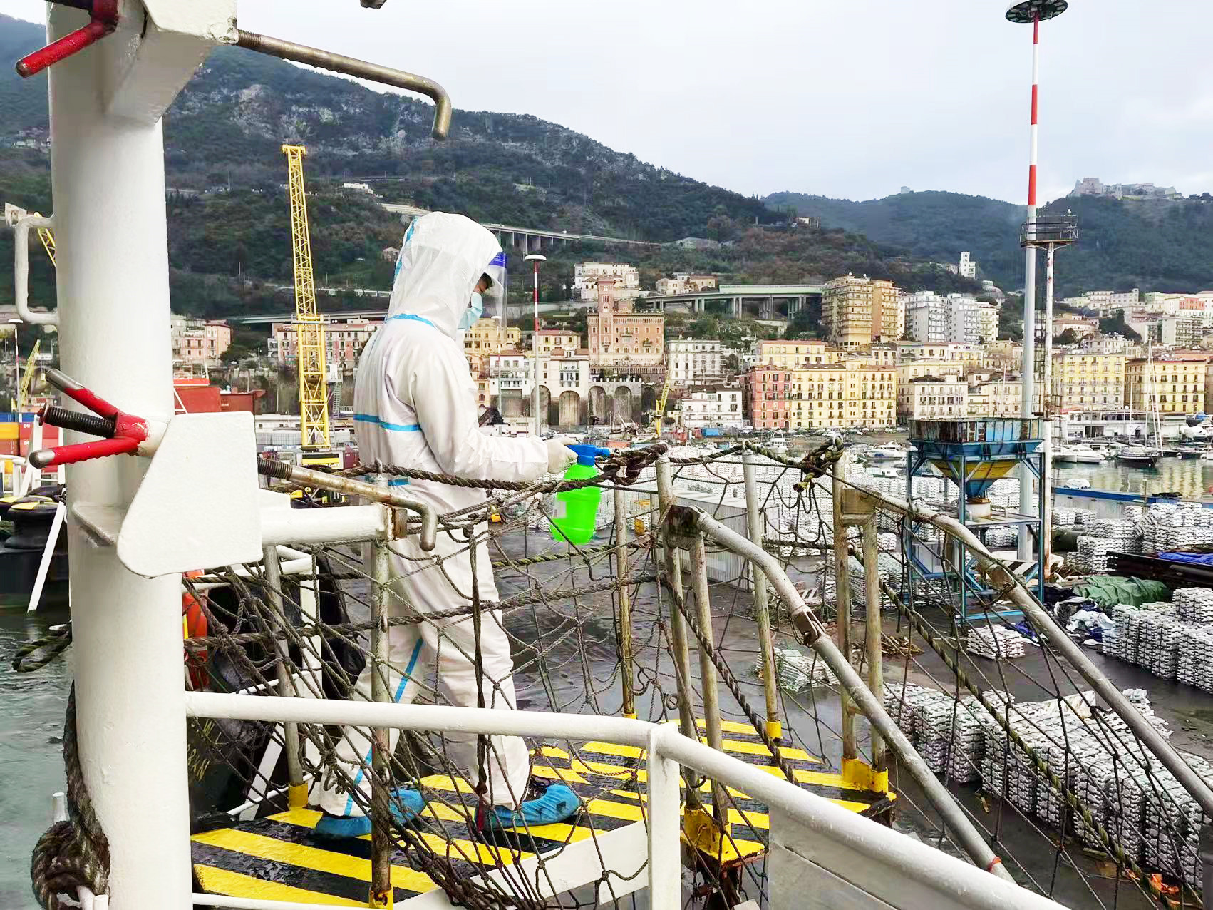 在意大利薩勒諾港,“江遠(yuǎn)常州”輪船員仔細(xì)地進(jìn)行舷梯消殺。