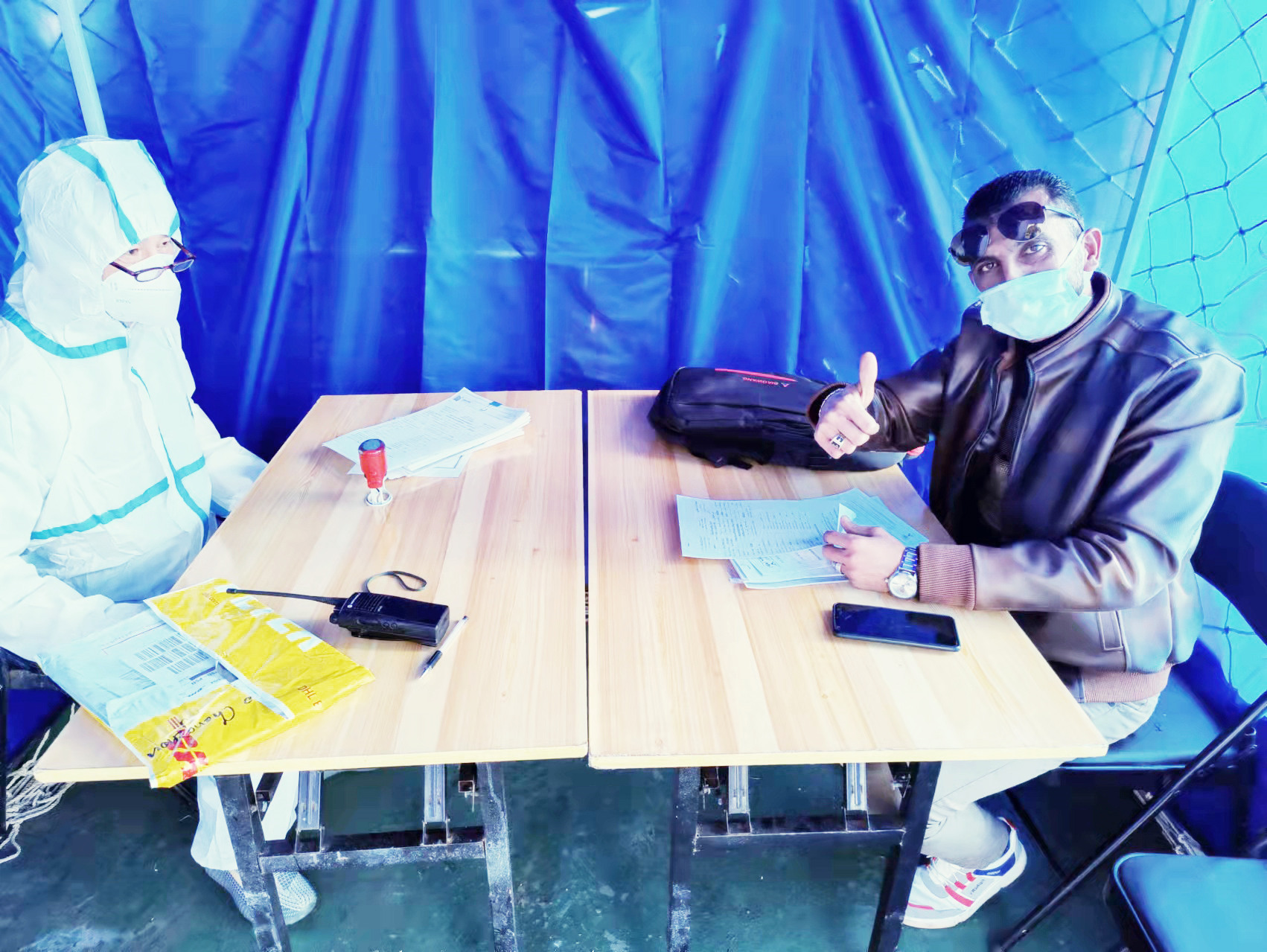 在韓國唐津港,“江遠(yuǎn)常州”輪船員身著防疫五件套,嚴(yán)格做好外來登輪人員的測溫和登記工作。