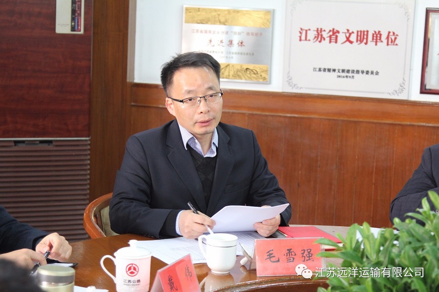 毛總首先向與會(huì)人員介紹了江蘇遠(yuǎn)洋領(lǐng)導(dǎo)班子的調(diào)整情況,并傳達(dá)了省港口集團(tuán)王永安董事長(zhǎng)在江蘇遠(yuǎn)洋領(lǐng)導(dǎo)班子調(diào)整會(huì)議上的講話精神,并對(duì)江蘇遠(yuǎn)洋新世紀(jì)2018年度工作提出了五點(diǎn)要求,一是要對(duì)江蘇遠(yuǎn)洋物流板塊的整合充滿信心,把新的發(fā)展機(jī)遇,轉(zhuǎn)化為內(nèi)生動(dòng)力,努力做大做強(qiáng)物流板塊。二是要增強(qiáng)政治意識(shí)、大局意識(shí)、廉潔意識(shí)、風(fēng)險(xiǎn)意識(shí)。三是要充分發(fā)揮好我們的整體優(yōu)勢(shì),依托集團(tuán)平臺(tái),充分利用好資源,不斷提升我們的攬貨能力和市場(chǎng)份額。四是要加強(qiáng)制度建設(shè),完善績(jī)效考核,充分調(diào)動(dòng)大家的積極性。五是要切實(shí)加強(qiáng)人才隊(duì)伍建設(shè),為創(chuàng)建一流的遠(yuǎn)洋物流提供人才支持和智力保障。