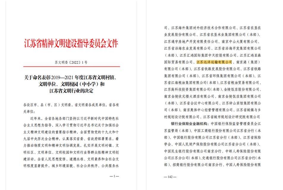 日前,江蘇省精神文明建設(shè)指導(dǎo)委員會發(fā)文表彰2019-2021年度江蘇省文明村鎮(zhèn)、文明單位、文明校園(中小學(xué))和江蘇省文明行業(yè),江蘇遠洋運輸有限公司(以下簡稱“江蘇遠洋”)再次榮獲“江蘇省文明單位”稱號。