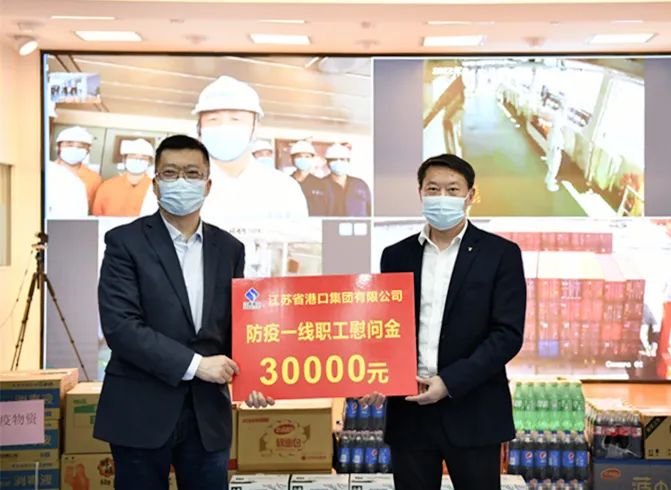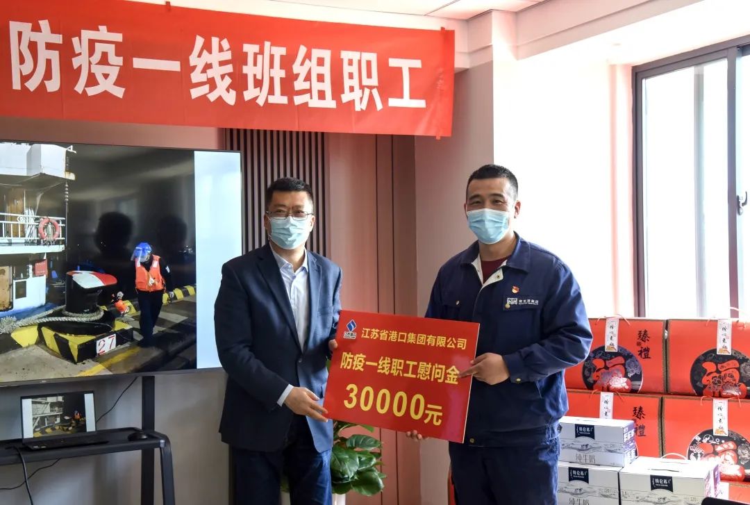 在南京港江北集裝箱公司,關(guān)永健向疫情期間堅持奮戰(zhàn)在疫情一線的“安全班”班組職工送上了慰問金和慰問品。