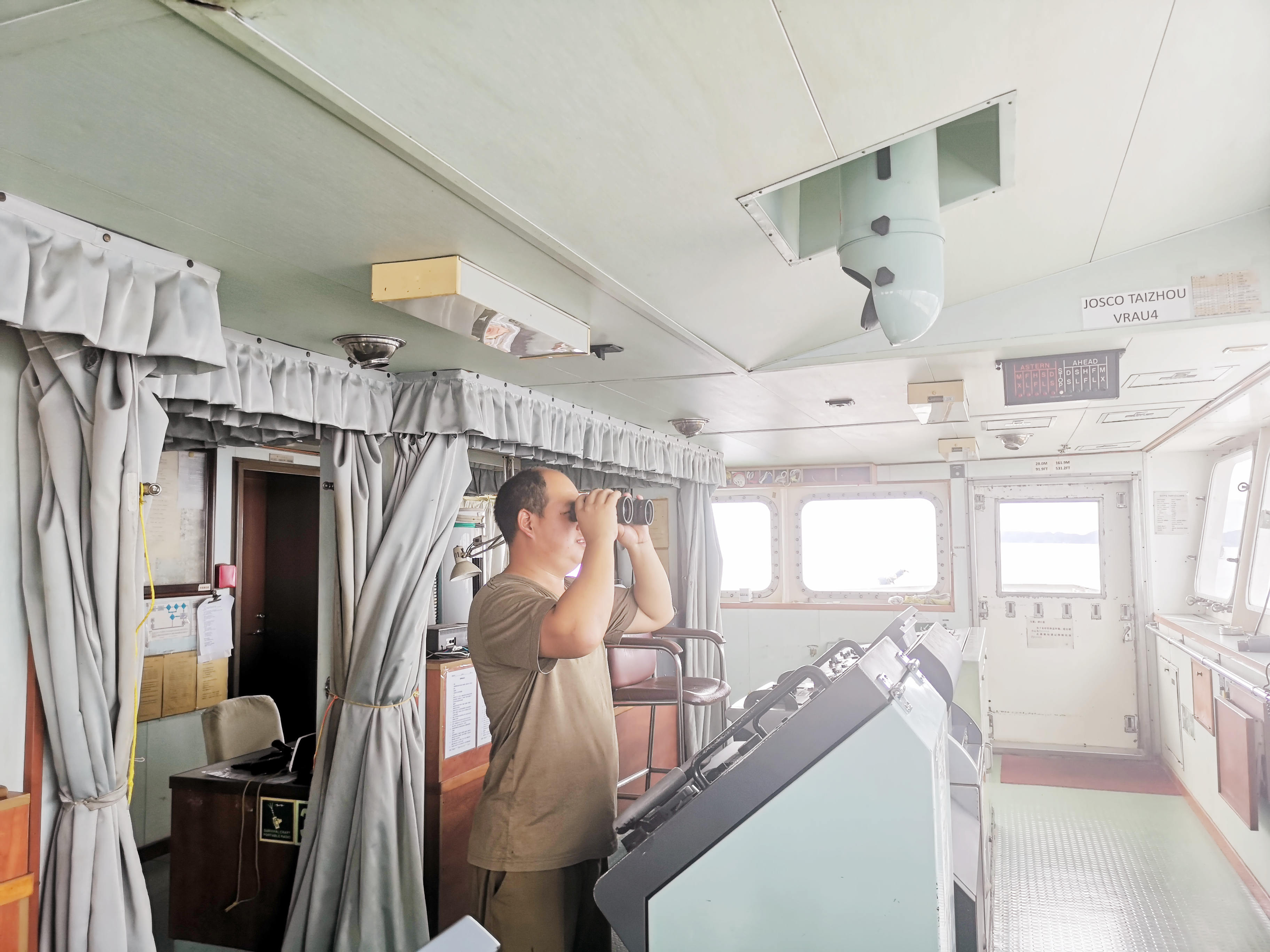 做完工作動員后,準(zhǔn)備出工。作為一名水手長,高空作業(yè)我肯定是“首發(fā)陣容”,要起到一定帶頭作用!此時,值班水手老曹和小周爭先恐后,就怕輪不到自己“踩鋼絲”…最終在他們的軟磨硬泡下,我被無情替換掉。