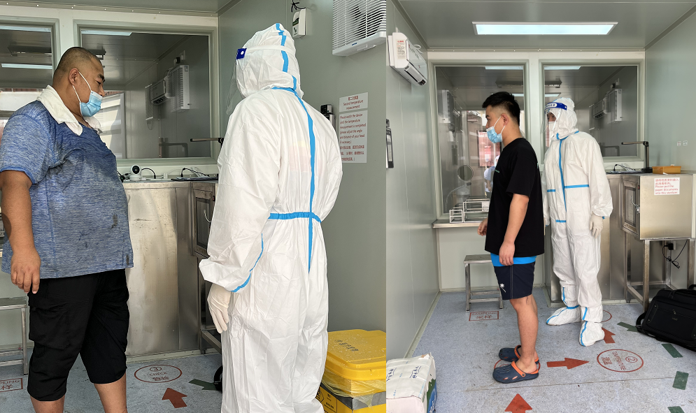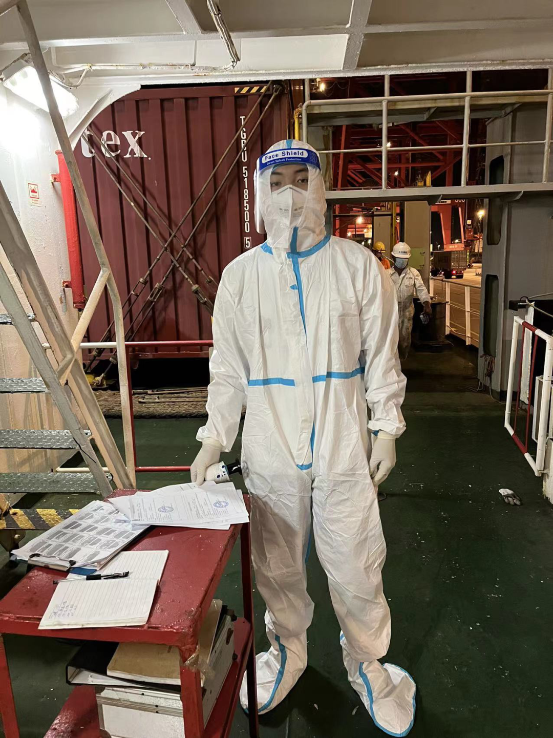 為了保障船期,烈日炎炎,專(zhuān)班人員全副武裝進(jìn)入密不透風(fēng)的遠(yuǎn)程檢查工作站,與海關(guān)調(diào)試后,第一時(shí)間進(jìn)行遠(yuǎn)程檢疫。下午正是最熱的時(shí)候,地表溫度已超40℃,檢疫結(jié)束后,手套里都是汗水,嗓子早已渴得快冒煙。下船后,消殺完畢,拉開(kāi)防護(hù)服的一瞬間,汗水成股往外灑,里面的短袖早已被浸透,摘下橡膠手套,汗水灑落一地,一雙手被汗水泡得發(fā)白。檢疫任務(wù)結(jié)束后,楊嘉洛說(shuō)道:“苦一點(diǎn)、累一點(diǎn)都不怕,疫情當(dāng)前,只要不耽誤每一條船的船期,能夠及時(shí)按照計(jì)劃靠離泊,付出的就值了!”為保障業(yè)務(wù)順暢,楊嘉洛和周秋國(guó)兩名專(zhuān)班人員輪班替換,每人在專(zhuān)班連續(xù)工作時(shí)間都不低于一個(gè)半月。