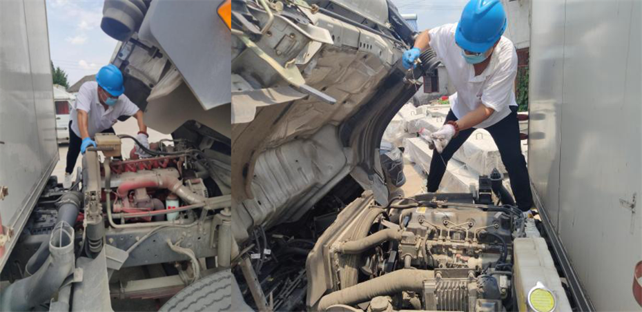 出車前安全員檢查機油、水箱存量等各項車輛安全指標,車用消防用品配備情況。