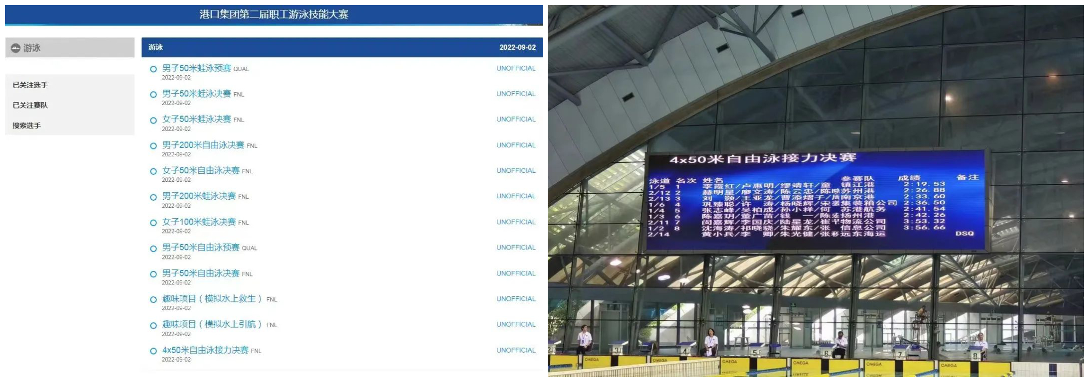 本次職工游泳技能大賽共設(shè)7個(gè)個(gè)人項(xiàng)目,3個(gè)團(tuán)體項(xiàng)目。來(lái)自集團(tuán)總部和所屬企業(yè)的12支代表隊(duì)近100名運(yùn)動(dòng)員參與角逐。此次技能競(jìng)賽是江蘇省港口集團(tuán)所屬各企業(yè)員工同場(chǎng)競(jìng)技、交流感情、增進(jìn)友誼的一次盛會(huì)。比賽場(chǎng)面氣氛熱烈,賽事安排井然有序。