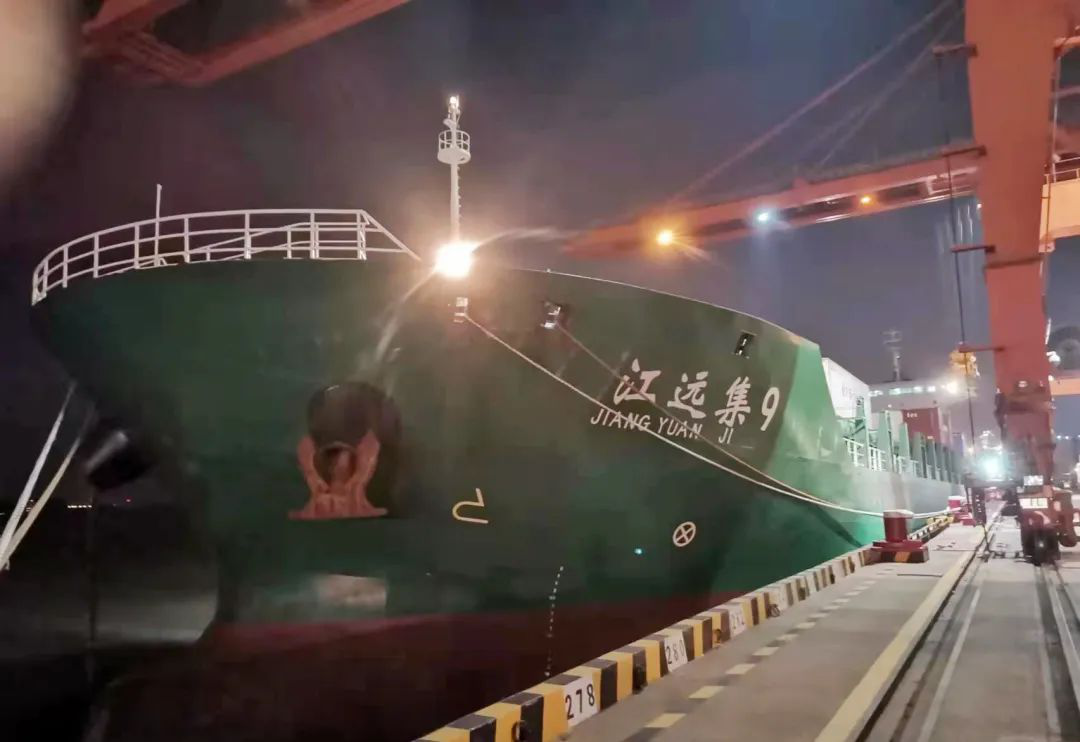 “江遠(yuǎn)集9”輪,總長(zhǎng)158米、船寬24.7米、型深12.6米,載貨量22037噸、載箱量1258TEU。