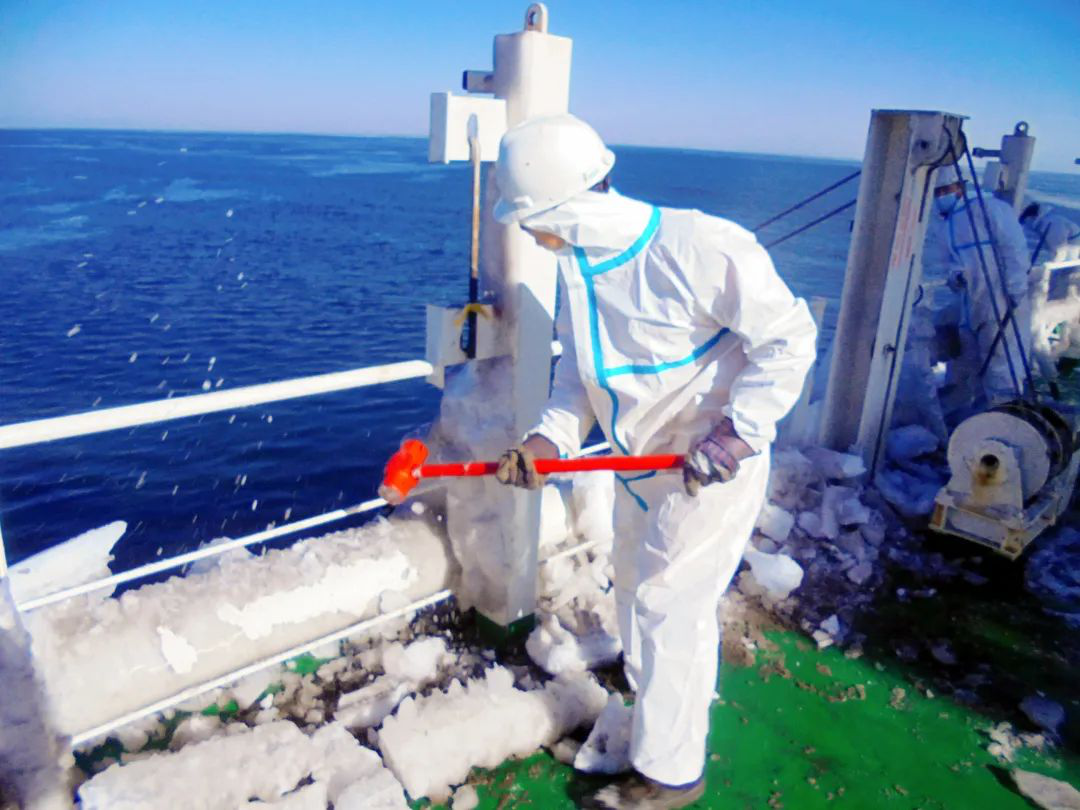 1月23日晚上,船航行至以兇險(xiǎn)、涌急出名的老鐵山水道時(shí),風(fēng)力一度達(dá)到八級,陣風(fēng)九到十級。船大幅度搖晃,橫搖最大至21°,涌起的巨浪一陣陣拍向主甲板和艙蓋板。次日清晨,所有人都被甲板上的景象驚呆了,天寒地凍,整條船已是銀裝素裹,像是披上了一層厚厚的鎧甲。艏樓、左右甲板、艙蓋板上全部被厚厚的冰雪覆蓋,欄桿上,錨機(jī)上到處都懸掛著冰雕,所有的艙蓋在冰雪覆蓋之下完全無法打開,甚至連甲板上也無法安全行走。
