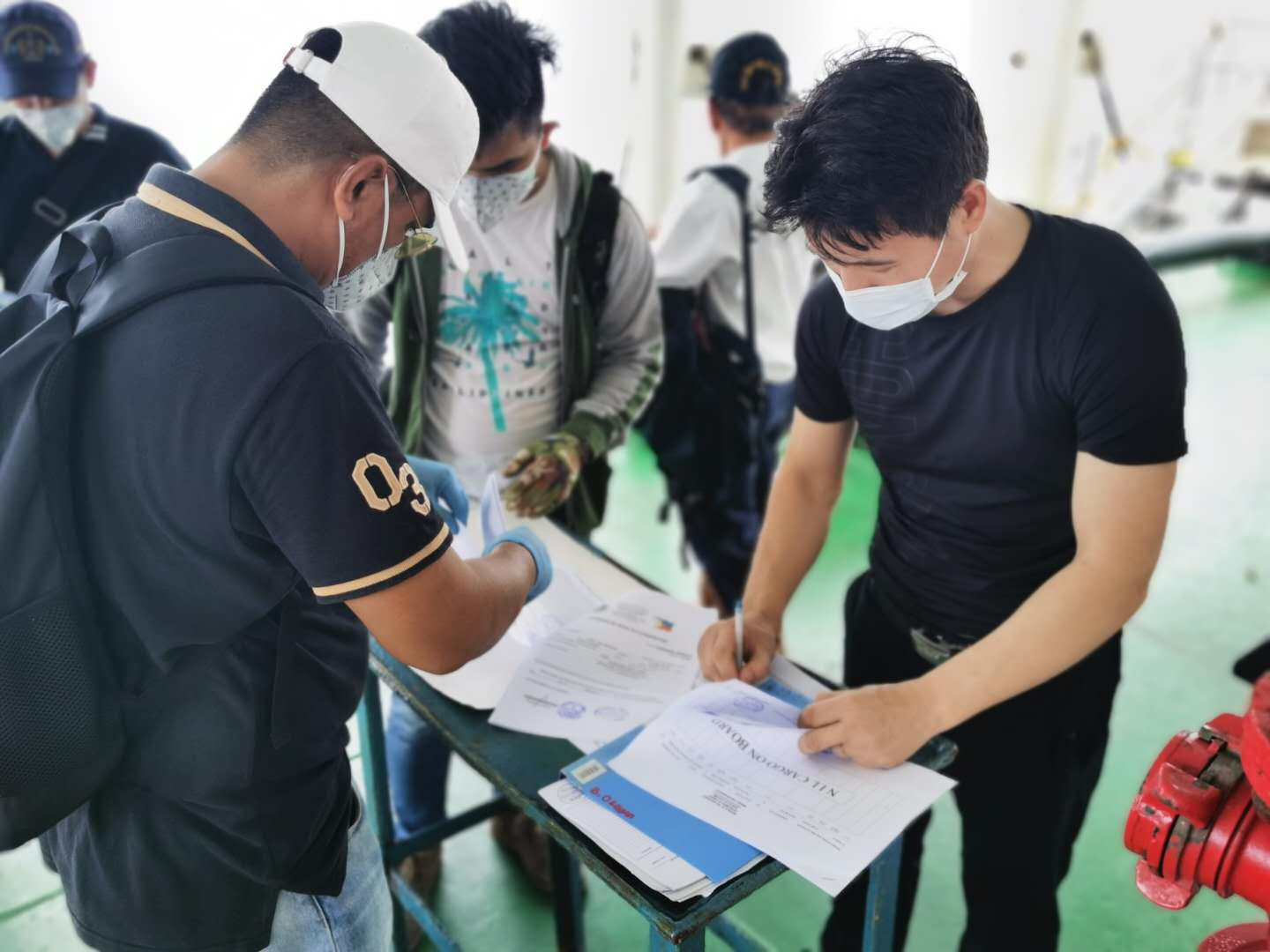 圖為江遠福州輪抵達菲律賓港口時衛(wèi)檢官員不進船艙,在室外辦理手續(xù)