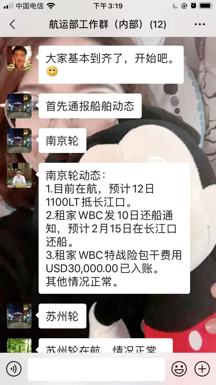 靈活安排線上辦公,確保工作不延誤。雖然復(fù)工日期推遲,但航運業(yè)的特殊性要求航運人必須時刻保持在工狀態(tài)。多艘船舶的租家因貿(mào)易需要,須進行換單及無單卸貨等操作,航運部各業(yè)務(wù)主管在家中開展線上辦公,及時回應(yīng)租家訴求,確保船舶順利運行;南京輪、潤州輪、常州輪等船舶在此期間航經(jīng)海盜風險區(qū),各業(yè)務(wù)主管及時與相關(guān)方聯(lián)系,妥善安排武裝保安及附加保險等工作。
