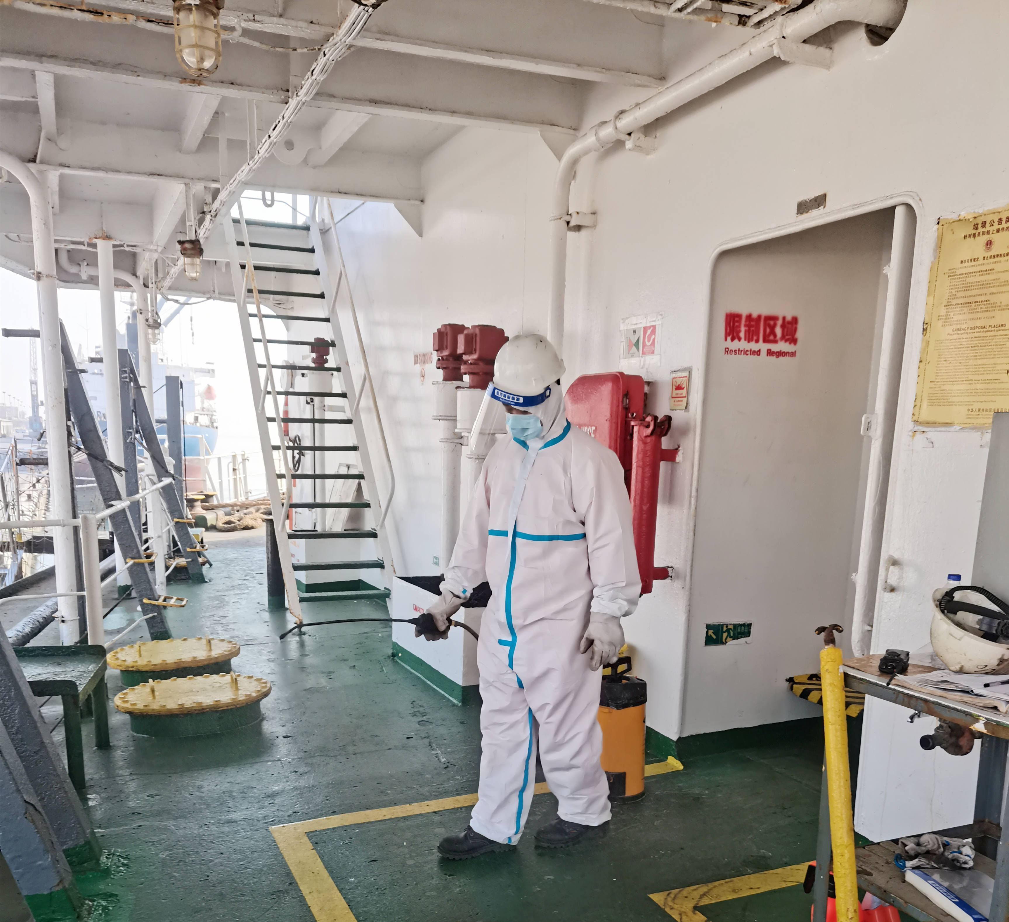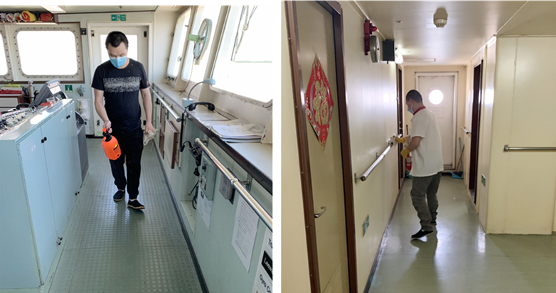 在關(guān)鍵細(xì)節(jié)上,大家更是容不得絲毫疏忽,如引航員、PSC官員等必須進(jìn)入船舶工作、生活區(qū)域的,一定要測(cè)量體溫,確保正常后在船員引導(dǎo)下方可沿規(guī)定路線進(jìn)入規(guī)定區(qū)域開(kāi)展工作,并對(duì)其所經(jīng)過(guò)區(qū)域嚴(yán)格消殺,相關(guān)船員全程嚴(yán)密防護(hù)、保持安全距離。船員進(jìn)入克令吊操縱室內(nèi),也要做好防護(hù),并對(duì)操縱室每一個(gè)角落實(shí)施消殺,杜絕潛在的風(fēng)險(xiǎn)。