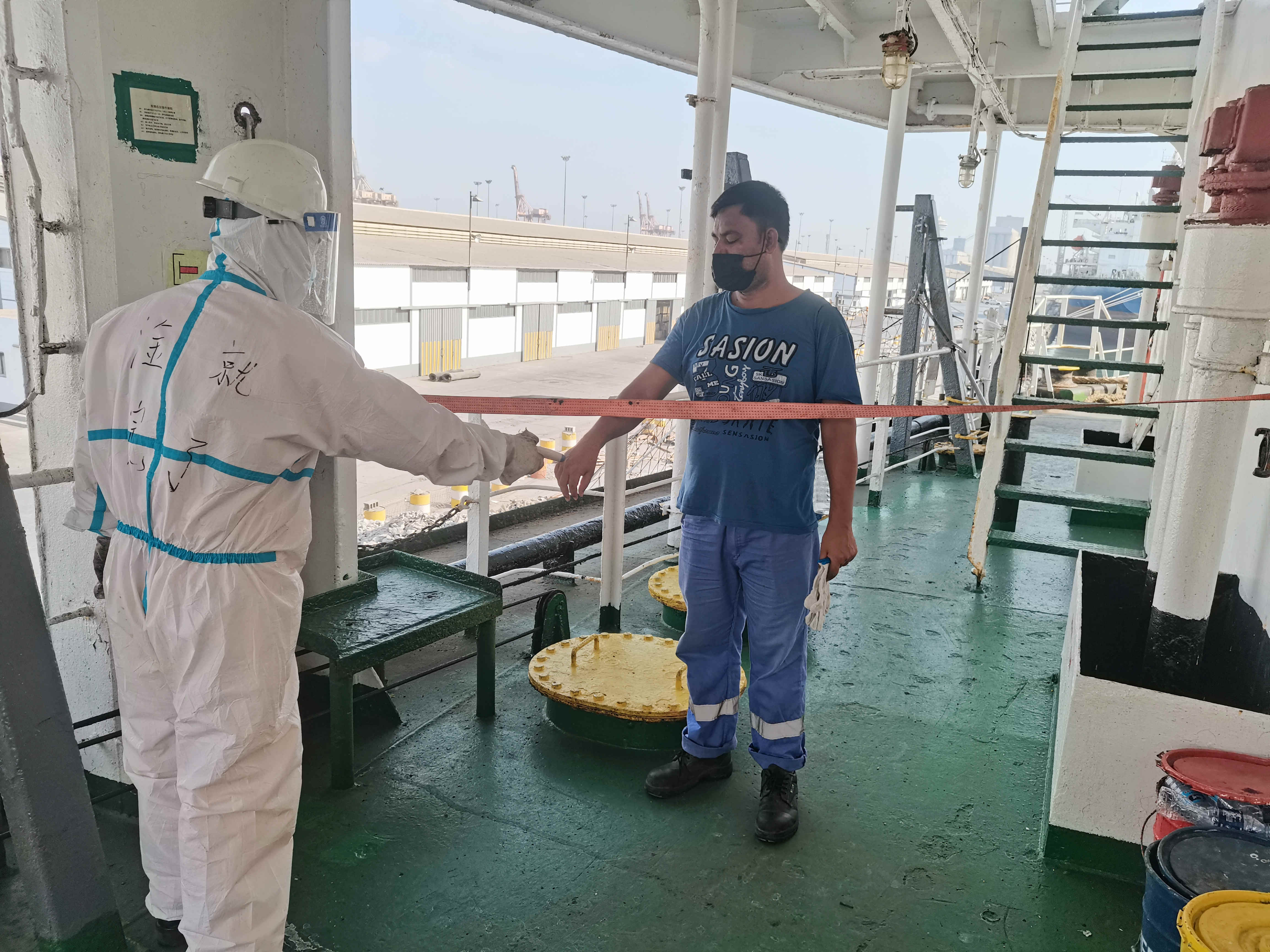 船舶疫情防控是一場(chǎng)持久戰(zhàn),考驗(yàn)的是船員的耐心決心。南京輪保持“如臨深淵、如履薄冰”的高度警惕,嚴(yán)把梯口、生活區(qū)、駕駛艙等主陣地,把梯口值班作為全船防疫的重中之重,值班人員“全副武裝”,穿戴好口罩、防護(hù)服、護(hù)目鏡,備好充足的消毒液和洗手液;在梯口設(shè)置隔離網(wǎng)、警戒線,做到船員非必要不出生活區(qū),港方作業(yè)人員嚴(yán)禁進(jìn)入生活區(qū);對(duì)上船作業(yè)人員嚴(yán)格測(cè)量體溫,并要求其采取防護(hù)措施、佩戴防護(hù)用品;非值班人員因工作需要出入生活區(qū),均需嚴(yán)格消殺,列表登記。