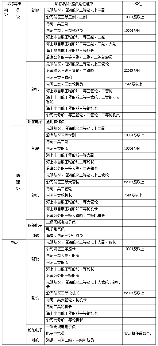 備注:本表由交通運輸部根據(jù)船員(引航員)適任證書有關(guān)類別、等級、職務(wù)設(shè)置變化情況做相應(yīng)調(diào)整,經(jīng)人力資源社會保障部備案后發(fā)布。