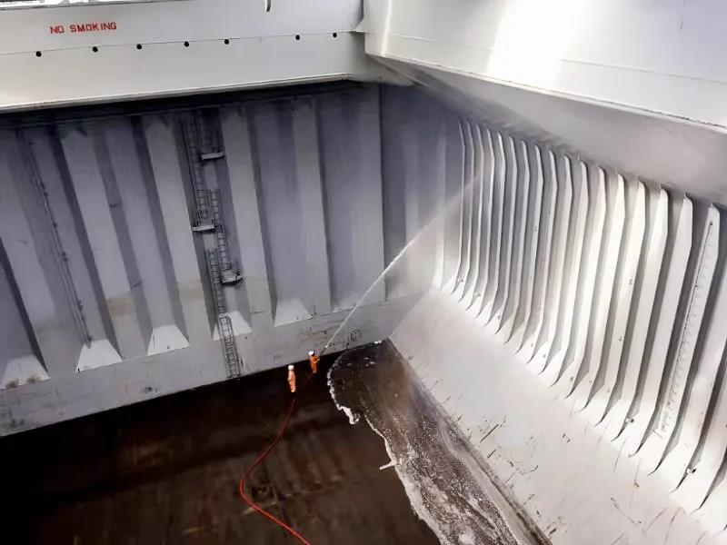 備艙并非想的那么容易,由于多個裝卸港口設備碾壓,形成了很多緊緊貼附在艙底、下斜坡上的垃圾塊。如果使用化學藥劑清洗,貨艙污水就不能排放入海,需要岸上接收,會產生大筆費用。只能靠船員一點點鏟刷,一個個貨艙慢慢清理。人停機不停,船員根據值班時間輪班工作,連續(xù)工作數個晝夜,最終在土耳其結束卸貨前就完成了大部分貨艙的準備和清洗工作。清洗后貨艙污水暫留于污水井內,污水量大的艙內將部分貨艙污水轉駁至搜集柜內,便于艙底清洗工作繼續(xù)開展。