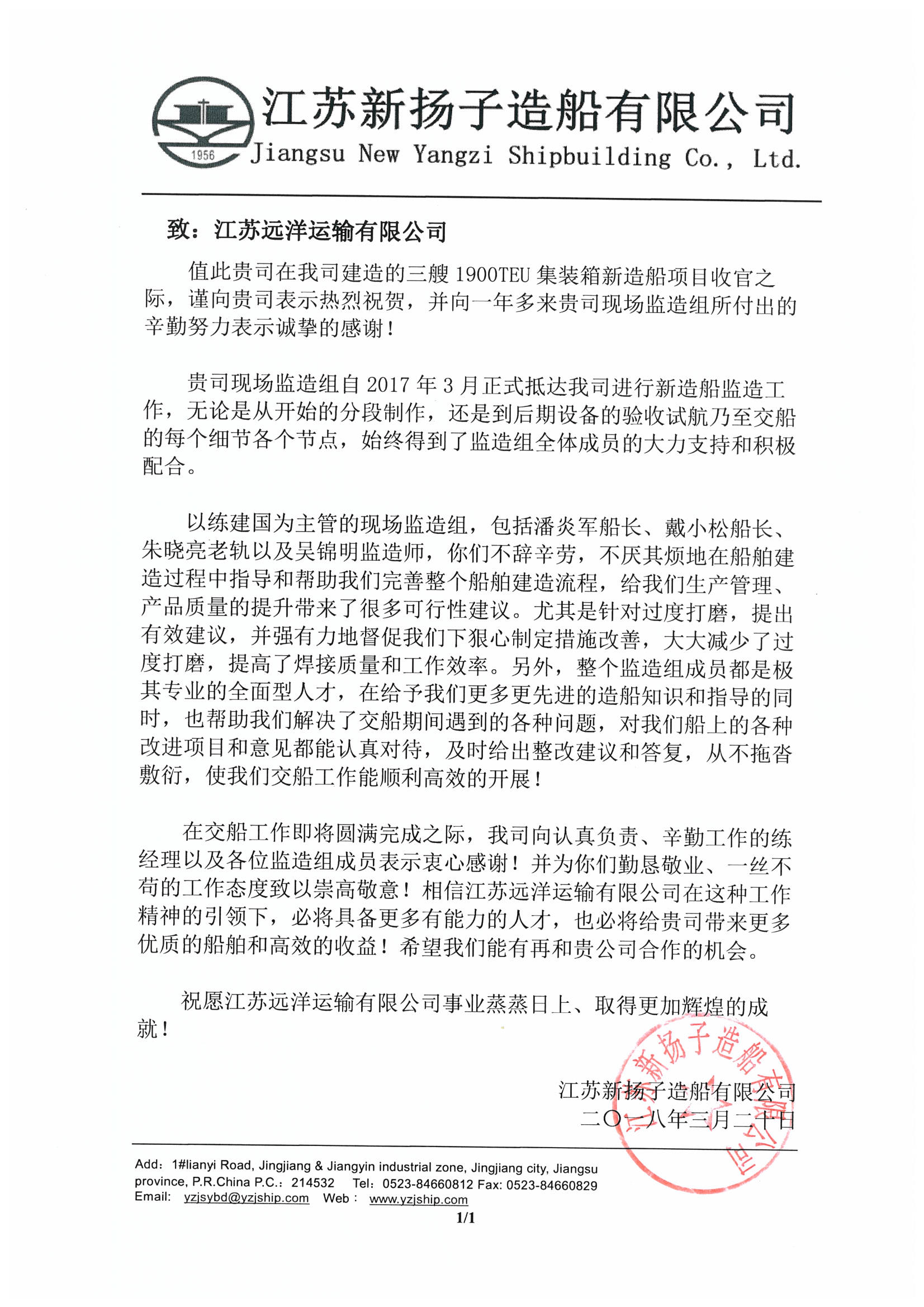 江蘇新?lián)P子造船有限公司給我司駐廠建造組發(fā)來感謝信,對建造組一年多來的工作表示肯定與感謝。
