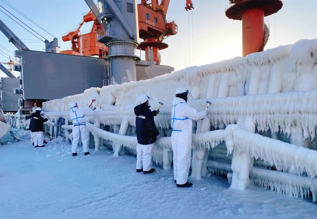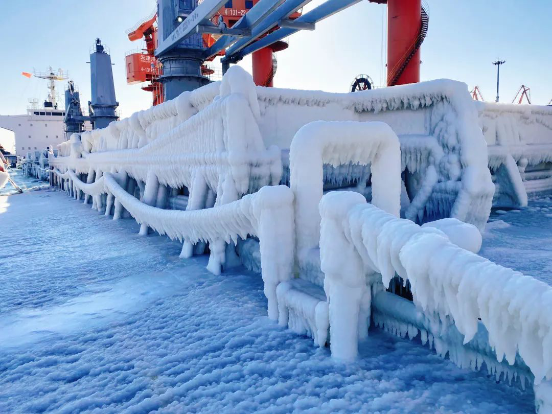 1月23日晚上,船航行至以兇險(xiǎn)、涌急出名的老鐵山水道時(shí),風(fēng)力一度達(dá)到八級,陣風(fēng)九到十級。船大幅度搖晃,橫搖最大至21°,涌起的巨浪一陣陣拍向主甲板和艙蓋板。次日清晨,所有人都被甲板上的景象驚呆了,天寒地凍,整條船已是銀裝素裹,像是披上了一層厚厚的鎧甲。艏樓、左右甲板、艙蓋板上全部被厚厚的冰雪覆蓋,欄桿上,錨機(jī)上到處都懸掛著冰雕,所有的艙蓋在冰雪覆蓋之下完全無法打開,甚至連甲板上也無法安全行走。