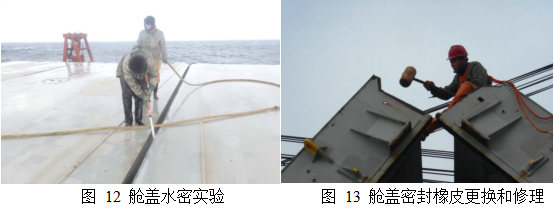 貨艙清潔和油漆工作完成后,船長、大副帶領船員對所有貨艙的艙蓋進行了水密試驗,由于在艙蓋的接縫處的密封橡皮年久沒有彈性,試驗發(fā)現(xiàn)三艙、四艙和五艙三個貨艙的艙蓋2條接縫16個邊角處漏水。由于船上密封橡皮備品不足,船員們開動腦筋,在密封橡皮底下增墊橡皮,臨時解決了水密問題。大家反復墊試,反復進行沖水測驗,加班加點終于趕在進港上引水前解決了艙蓋水密問題。