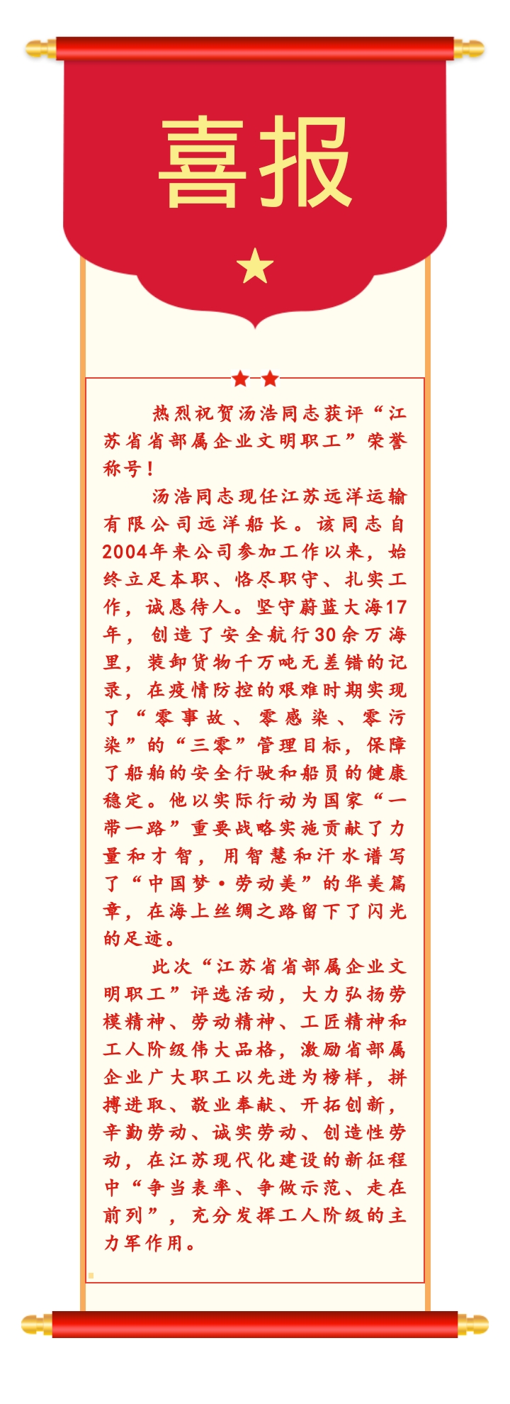 喜報(bào) —— 湯浩船長獲評“江蘇省部屬企業(yè)文明職工”榮譽(yù)稱號