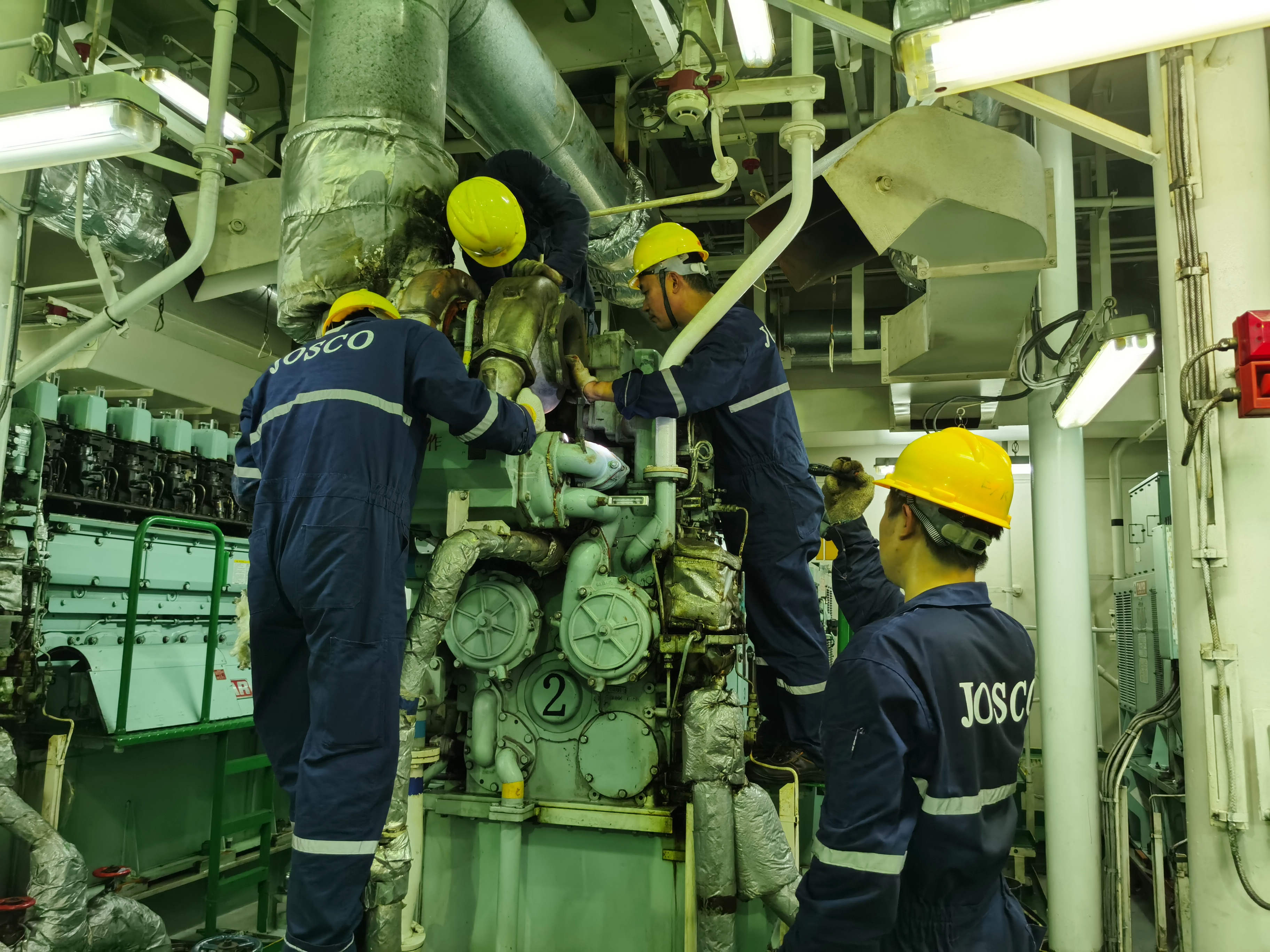 此時(shí)已是深夜,江蘇遠(yuǎn)洋岸基團(tuán)隊(duì)同樣熬著夜、懸著心。經(jīng)過船上和岸基管理團(tuán)隊(duì)共同研究,為確保萬無一失,決定同時(shí)進(jìn)行兩套搶修方案。方案一,焊接、修理損壞的舊水套,再安裝并進(jìn)行封缸運(yùn)行;方案二,用砂紙打磨新水套內(nèi)圈、調(diào)整尺寸,再安裝、進(jìn)行封缸運(yùn)行。在輪機(jī)長陸蘭峰、大管輪孟濤帶領(lǐng)下,機(jī)艙全體人員默契配合,徹夜未眠、連續(xù)奮戰(zhàn),每個(gè)人的眼睛里都因焦急、熬夜而布滿血絲。一場困難重重的“終極賽跑”終于在船上時(shí)間11月20日迎來勝利的曙光。舊水套經(jīng)過焊接修理后,被成功安裝。此時(shí),所有人都舒了一口氣,船暫時(shí)安全了。但出于對船航行安全的長遠(yuǎn)考慮,大管輪孟濤建議將舊水套拆除,換上打磨好的新水套。奮戰(zhàn)一夜,大家都已經(jīng)疲倦異常。但考慮到用舊水套封缸運(yùn)行也存在很大風(fēng)險(xiǎn),還要抵抗后續(xù)海上的惡劣天氣。于是,大家果斷決定,采納孟濤的建議,拆掉舊水套、重新安裝新水套。有了前面的安裝經(jīng)驗(yàn),在經(jīng)過多次調(diào)試調(diào)整后,新水套被成功裝到了5號發(fā)動(dòng)機(jī)缸頭上。那一瞬間,鋪天蓋地的喜悅充滿了整個(gè)機(jī)艙,慶幸、感動(dòng)還有滿滿的激動(dòng)洋溢在21個(gè)兄弟之間。