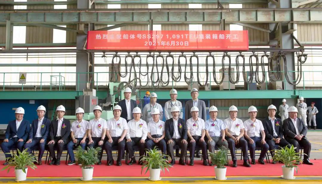 江蘇遠(yuǎn)洋所屬太倉海運與常石舟山船廠簽訂3艘1091TEU集裝箱船(SS297/298/299)投資建造合同。6月30日上午,第一艘1091 TEU集裝箱船SS297在常石舟山船廠青山加工車間舉行了開工儀式。常石舟山造船總經(jīng)理佐藤二郎等廠方代表,NK船級社中國公司總裁東史彥等NK船級社代表,江蘇遠(yuǎn)洋黨委書記、董事長晁陽等船東代表,三方領(lǐng)導(dǎo)代表出席了開工儀式,共同見證這一重要時刻。