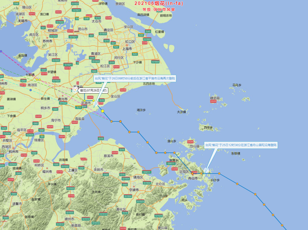 7月25日12時(shí)30分,第6號(hào)臺(tái)風(fēng)“煙花”已于前后登陸浙江省舟山市普陀區(qū)。7月26日14時(shí),“煙花”的風(fēng)速為25米/秒,移速為7公里/小時(shí),近中心最大風(fēng)力10級(jí)。